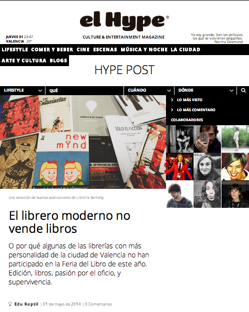 Aquí está uno de los artículos que más ganas tenía de escribir desde hace tiempo: ‘El librero moderno no vende libros’, cita por cierto atribuida a Jaime, de Slaughterhouse. ¿Por qué algunas de las mejores librerías de Valencia no han participado en la Feria del Libro? Los responsables de Librería Dadá, Librería Bartleby, Le petit Canibaal, y Slaughterhouse nos lo cuentan. ¡Gracias a todos los que leyéndolo, habéis hecho que sea lo más visto en la revista!