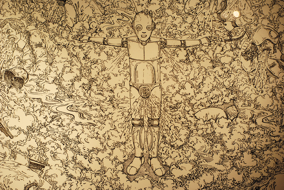 Subiendo unas escaleras llego a lo que más me ha gustado. La obra del checo Kownacki, consistente en una serie de trabajos que sirvieron para la pieza de animación que se proyecta en la sala, y que da nombre a su exposición. Sinceramente me ha fascinado. Lo mejor de la ilustración cyberpunk japonesa (Akira, Evangelion), con toques incluso al mundo metálico de Testuo, the ironman, todo aliñado con una BSO que me recordaba a uno de los primeros juegos que tuve en la GameBoy, el Probotector 2. No creo que sea una casualidad. Kownacki critica y satiriza, pero además perturba e incluso molesta. El engendro mecánico que surge del huevo primero es un insecto, luego parece la máscara de Donnie Darko, luego da a luz a un conejo y posteriormente ocurre de todo. Genial, repito. Para colmo, el precio de las obras expuestas no es nada descabellado, desde 250 euros. No me lo puedo permitir ahora mismo, pero desde luego no es una locura, ni mucho menos. Una combinación de trabajos a tinta, xilografía, litografía y acuarela digna de ser vista. Lo minucioso del trazo del checo es una muestra de que es heredero de los mejores del género. El detalle de este tipo de obras es espectacular, quien quiera acercarse al cyberpunk y entender a qué me refiero, que se agencie el cómic Hard Boiled. Tras terminar de ver todo, he hablado un poco más con María Tinoco y me he ido, satisfecho y convencido de que es necesario perderle el miedo a lo desconocido. Yo no soy, como comentaba, experto en esta materia, pero es tan fácil como visitar una galería como Mr. Pink y dejarse llevar. Y por supuesto ayudar a que tenga la difusión y el eco que merece.