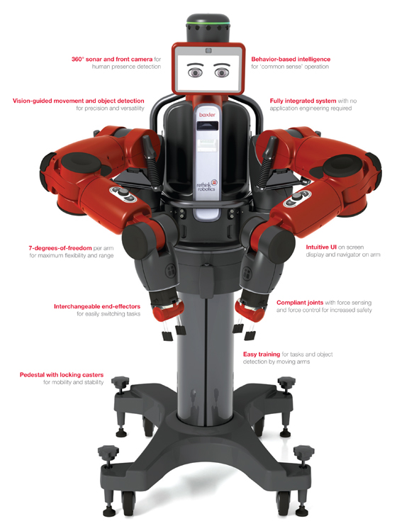 Rethink Robotics, una ambiciosa start-up estadounidense, es la empresa que lo ha desarrollado, y Rodney A. Brooks es el fundador de la misma y a quien Baxter llamará padre cuando tome conciencia de sí mismo en un futuro lejano y busque respuestas sobre el misterio de la existencia. Uno de los valores fundamentales de este ingenio, es que no es necesario que esté aislado en una cámara de seguridad para que no pueda dañar a sus compañeros humanos, sino que puede convivir con ellos con naturalidad y sin peligro alguno. Para ello dispone de una serie de sensores y dispositivos que impiden que pueda arrollar o golpear a algún trabajador. Además, está protegido por una inofensiva cubierta de plástico. Aunque será posible programarlo, sus creadores prefieren hablar de «training by demonstration», es decir, formación o aprendizaje por demostración. Los operarios pueden instruir a Baxter para que realice las operaciones necesarias para la industria que lo adquiera, a partir de octubre, por 22.000 dólares. Para colmo, el robot tiene un gran botón rojo llamado e-STOP para que se detenga de inmediato, en el caso de que haya cogido por las solapas a algún superior y esté zarandeándolo sin control [es broma].