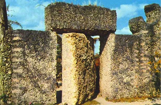 Leedskalnin nació en Letonia en 1887. A los 26 se prometió con Agnes Scuffs, su Sweet Sixteen diez años menor que él, que decidió cancelar la boda un día antes de que se celebrase. Este hecho supuso una grave herida a Leedskalnin, que decidió emigrar a Norteamérica, donde trabajó en aserraderos de Canadá, California o Tejas. En 1919, enfermo de tuberculosis, se mudó a Florida City, donde compró el terreno en el que comenzaría a construir su leyenda, a modo de enorme monumento de piedra dedicado a la mujer que lo abandonó y al que bautizó como Rock Gate Park. Para llevar a cabo este peculiar proyecto, empleó herramientas sacadas de desguaces y vertederos, y piedra coral. A partir de 1936, y durante tres años, según algunas fuentes a causa de una agresión, según otras, en busca de más espacio, Edward desplazó -sí, desplazó- los muchos centenares de toneladas de piedra que había extraído y trabajado de noche -sí, de noche-, él solo -ÉL SOLO-, hasta Homestead, a 16 kilómetros de su ubicación inicial, a un nuevo terreno de cuatro hectáreas. Para ello empleó un tractor y un remolque. Este enigmático romántico afirmaba que había descubierto la técnica que emplearon los egipcios para construir las pirámides; decía que podía mover rocas de ese calibre dado que conocía los secretos de la gravedad. El hecho de que fuese tan esquivo a la hora de trabajar alimentó el misterio que se llevó a la tumba en 1951. Probablemente, de lo más impresionante que se puede encontrar en este parque al que se ha llamado también El castillo de coral, es una puerta de piedra de casi nueve toneladas que gira sobre su eje y puede ser empujada por un niño pequeño.